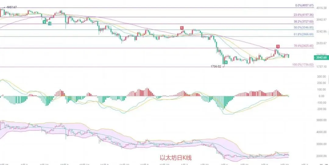 以太坊日线级别呈现单边弱势下行格局,开盘后多头短暂试探2100关口阻力无果随即承压回落,价格连续跌破MA7、MA30等关键均线支撑,中期下行通道进一步打开,成交量伴随下跌温和放大,呈现破位放量特征,买盘承接力度薄弱,空头动能持续释放,MACD指标零轴上方死叉后绿柱持续扩张,确认空头主导趋势,日内最低下探至2033美元附近,24小时跌幅超3.5%,短期反弹受MA14均线与2100-2120区间强压制约,下方2000整数关口为关键心理支撑,若失守则大概率下探1980-1970区间,整体日线结构维持空头主导的弱势震荡。