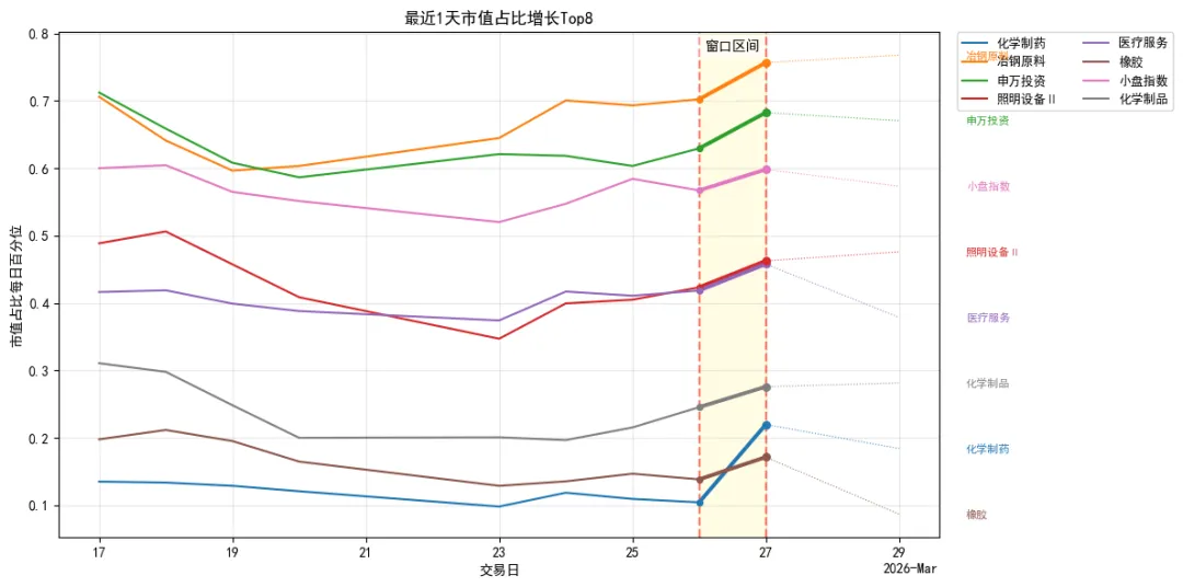 化学制药、冶钢原料、申万投资、照明设备Ⅱ、医疗服务、橡胶、小盘指数、化学制品