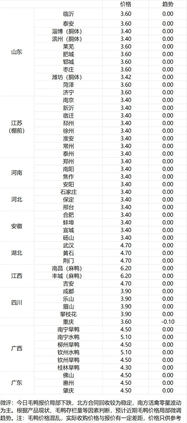 微评:鸭苗报价稳定。(注:南方只报当天价格)苗量少,计划紧张,养殖端成本高企,合同发放量控制。根据产品、养殖成本及鸭苗现状分析,预计近期鸭苗价格呈震荡走低趋势。种蛋报价涨5分。温馨提示:该价格为主流厂家报价,实际销售价格以成交价格为准,价格仅供参考。
