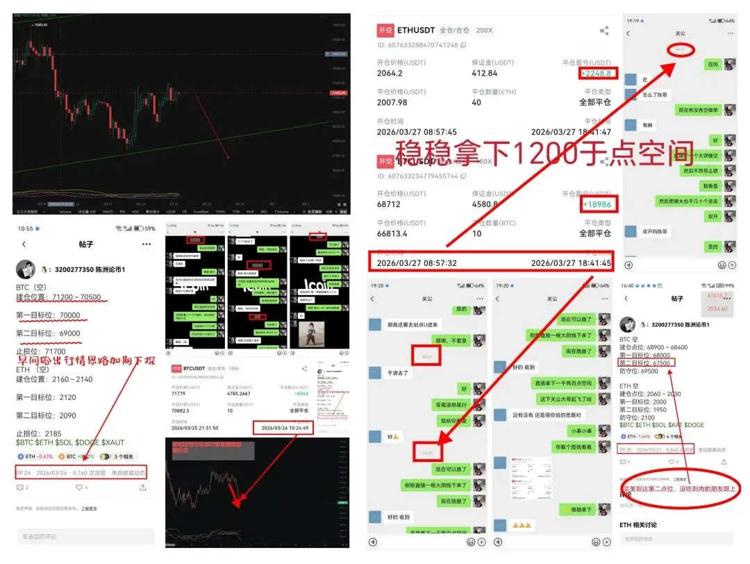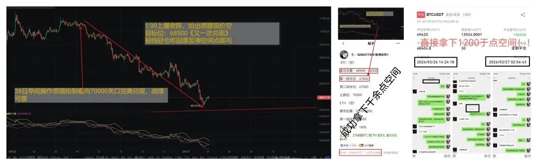 午后行情直接瀑布往下砸,BTC一路跌到68553,持仓利润越滚越大,二次补挂的空单也同步吃肉,列表里全是“到位了”“已经落袋”的消息。