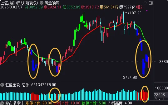 通过汇盈软件(如大盘分析战法、顶底先知等指标)观察,当前市场已出现多个底部特征信号。例如,指标已出现代表相对低位的“蓝色”区域,以及较罕见的代表大级别底部的“紫色”区域信号。
