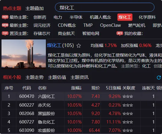 找到板块:在软件中输入“煤化工”,利用主题功能找到该主题下的所有股票。