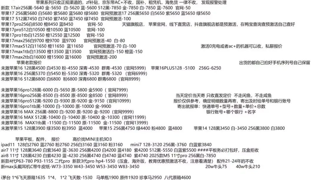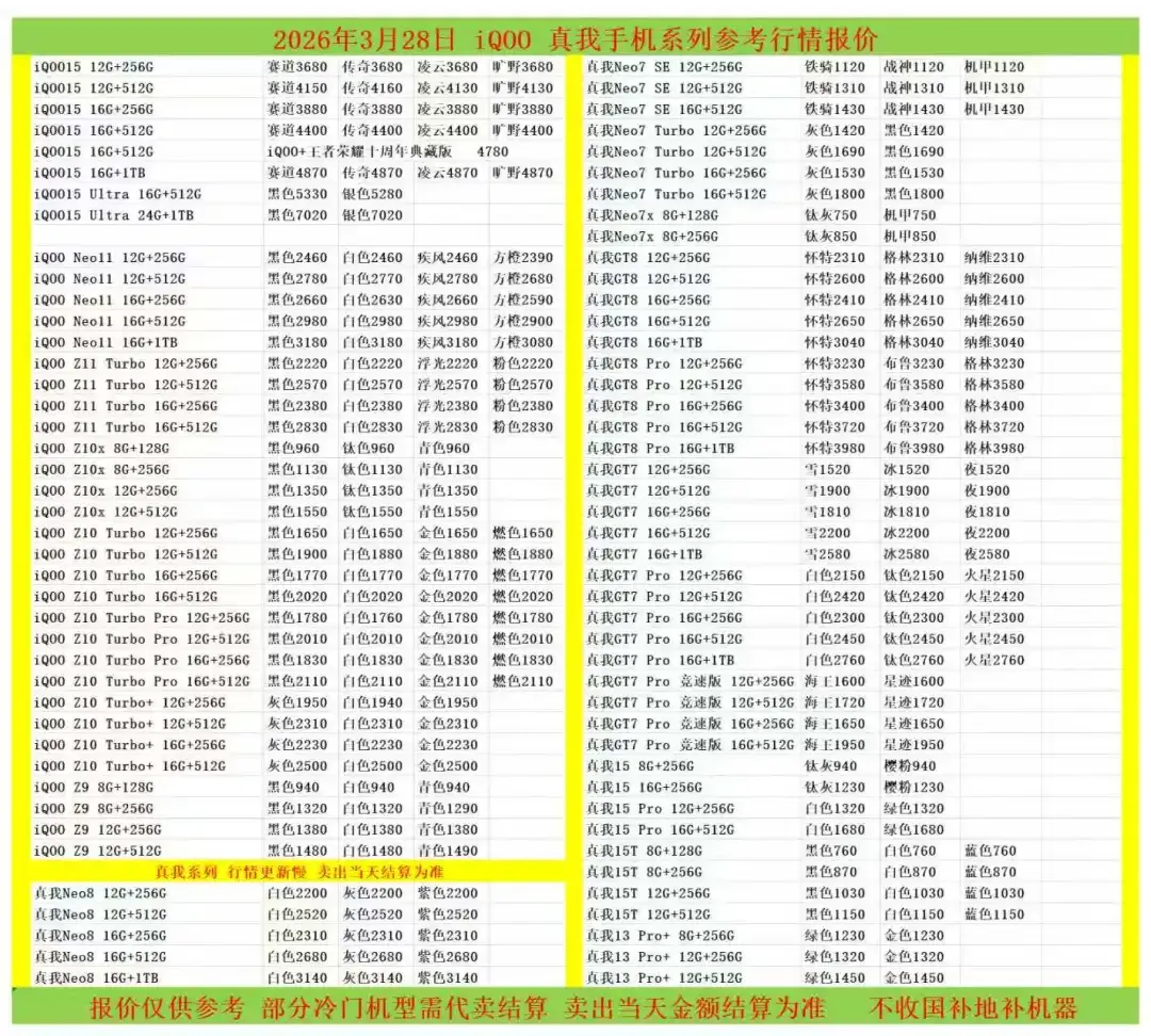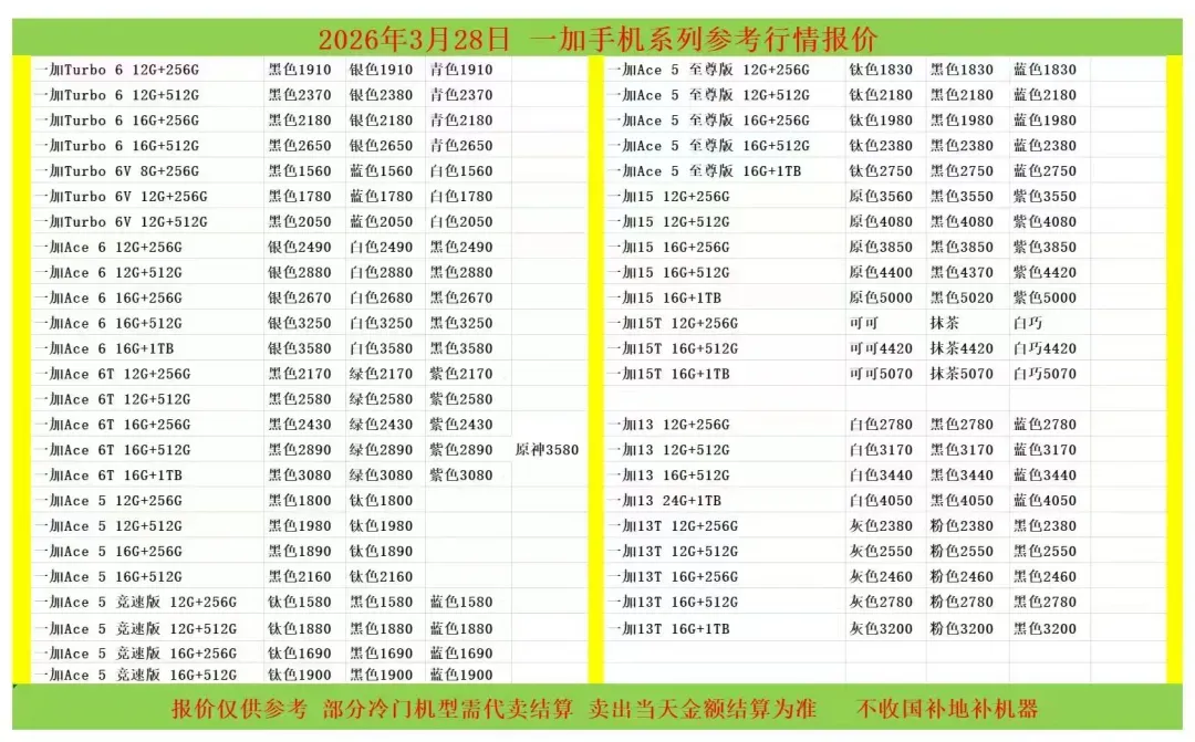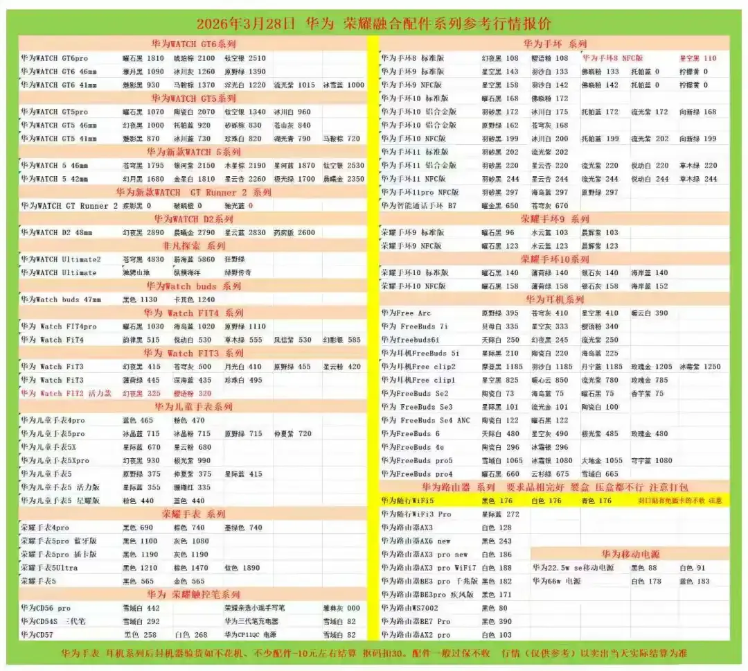 任天堂游戏机: 新款二代NS2港版标配机:3295 新款二代NS2港版马车机:3535,没游戏码:3260(注意下单要看有没有游戏码的 要不然就是便宜的) 新款二代NS2新加坡版 台版 单机:3210,就是没有游戏的 新款二代NS2韩版 欧版 美版 单机:3180,就是没有游戏的 新款二代NS2新加坡版同捆:3500,没游戏码:3200 NS2港版宝可梦同捆:3600 OLED屏 日版白-25年生产日期1850,非25年-30 彩色-1980 OLED屏 港版白-1810 彩色-1930 OLED屏 国行白-1645 彩色-1645 OLED屏 朱紫港版-1970 日版-1970 OLED屏 喷射港版-1970 日版-1970 健身环国行-145 海外版-340 LITE日版 港版 蓝:1040,黑粉1040,绿黄1040 注意区分,这些就不是oled屏的 价格以下(续航版) NS续航国彩-1430 黑-1310,拆封-50 NS续航日彩-1560 黑-1470 长款-30 这两天ps游戏机变化大 按到货行情结算 索尼PS5游戏机 (PS5都要留好纸箱带来,以免破坏品相) 2024新款:PS5 PRO日数: 2024新款:PS5 PRO港数: 2025新款:PS5 PRO国数: 2023新款ps5 日版光驱Slim: 2023新款ps5 日版数字Slim: 2023新款ps5 国行光驱Slim:老款:,2025新款 2023新款ps5 国行数字Slim: 2023新款ps5 港版光驱Slim: 2023新款ps5 港版数字Slim: PS5国行手柄普通色:420,珠白靛青凫绿425,外版-20 PSP串流机:1475白,1475黑 PS5单国光驱:575,外版525 ROG XBOX :6730 OLED SteamDeck掌机掌上游戏机 512G 美:4730,日港:4730 OLED SteamDeck掌机掌上游戏机 1TB 美:5380,日港:5380 大疆3标准:,全能: 大疆Action4标准:,全能: 大疆ACT5 Pro标准:,全能: 大疆action5pro畅拍: 大疆AC6标准: 大疆AC6畅拍: 大疆NEO标配:,全能: 大疆OM7P:,om7: 大疆 mic1拖1:,1拖2: o4图传: 拍立得MINI12影像花室套装:,外版,一次成像礼盒装 拍立得SE国行:,白色: 拍立得相纸20张:122,10张:61 拍立得锡纸装10张:58 任天堂 手柄 NS左右手柄:355 NS2左右手柄:420 NS2 PRO 黑柄:420 PRO国黑柄:310,外版280只收跨境 PRO乱斗柄:330只收跨境 PRO王泪柄:330只收跨境 PRO喷射柄:330只收跨境 PRO异度柄:330只收跨境 3月28 行情参考 大疆pk3标准2535 大疆pk3全能3230 大疆ac4标准1225 大疆ac5标准1885 大疆ac5畅拍2440 大疆ac6标准2725 大疆ac6畅拍3250 大疆nano 64 :1730 大疆nano128:2020 大疆o4pro图传1450(26年一月份的不要) mini一拖二 465 云台7P 485 【大疆系列只收待更新状态的机器 后封/在保代卖或扣款】 影石acepro一代1340 影石go3s 64 黑白1450 影石go3s 128 黑白1640 影石acepro2单电黑2290 影石acepro2单电白2335 影石acepro2双电黑2350 影石acepro2玩拍套装3460 影石x5标准黑2640 影石x5全能3130 影石go ultra黑2110白2110 影石aceproPro2 街拍黑 275银 285 影石128内存卡200 影石256内存卡360 影石512内存卡620 遮光罩80 影石114自拍杆65 2026年3月28日 华为配件全系列 行情参考 以结算价为准 华为 Watch FiT4 黑520白530绿555紫530银585 华为 Watch FIT4 pro 黑1065蓝1035绿1145 华为WATCH FIT 3 黑415灰505月光白410原野绿455粉420薄荷绿445蓝435珍珠白495 华为WATCH FIT 2活力款 黑色325粉320 Watch D2 黑 2895白2795蓝2835 药房版 2615 Watch buds 黑1135卡其色 1245 GT4 41m 白 00黑00 GT4 46m 黑00 Watch 5 46m 黑1800紫2155棕 2205蓝1875钛空银 2535 Watch 5 42m 黑1685白1820杏2265绿1710金2355 非凡2 黑4845蓝5875 非凡手表 黑00 华为新款WATCH GT6系列 GT6 pro 黑1820棕2105钢2520 GT6 46m黑 1095灰色 1265绿色 1395 GT6 41m 黑 935棕色 1375白色 1225紫色1020蓝1005 华为新款WATCH GT5系列 GT5 46黑1005蓝925棕835灰845 GT5 41 黑 875蓝735白825青795棕725 GT5pro 黑1075陶瓷2075钛钢色 1345冰川白965 华为儿童手表系列 儿童4pro蓝465粉470 儿童5pro 蓝720粉720绿720紫725 儿童5X 蓝675粉685 儿童5Xpro 黑935紫995 儿童5 绿375紫375蓝415活力蓝355红335 儿童5星耀 粉440蓝440 荣耀,华为手环 荣耀手环9标准黑93蓝100紫100 荣耀手环9NFC 黑120蓝120紫120 荣耀手环10标准黑138绿138灰138蓝138 荣耀手环10NFC 黑155灰155绿155蓝150 华为手环系列 华为手环8标准黑105粉108 华为手环8NFC 黑108 华为手环9 黑140白130粉130 华为手环9nfc版 黑155白140粉140 华为手环10标准 黑165粉169 华为手环10铝合金款 黑169白173蓝170紫170向新绿165原野绿160灰165 华为手环10NFC 黑197白198蓝197紫200绿197 华为手环11 标准版 羽砂黑 200流光紫 200 华为手环11 铝合金版 羽砂黑 217星云杏217流光紫217悦动白217草木绿 217 华为手环11 NFC版 羽砂黑 242星云杏 242流光紫 242悦动白 242草木绿242 华为手环11pro NFC版 羽砂黑 295海岛蓝295原野绿295 B7 黑655灰675 华为耳机系列 华为Free Arc 绿395灰410黑410白390 华为 FreeBuds 7i 白335灰332粉338 华为freebuds6i耳机 白250黑245紫250 华为耳机Free clip2 黑1190白1190蓝1190金1210紫1255 华为耳机Free clip 黑色830暖星云855紫 785玫瑰金790 华为耳机FreeBuds 5i 黑207白219蓝223 华为FreeBuds se2 耳机 白70蓝72黑72紫72 华为 FreeBuds se3 黑98金98白97 华为 FreeBuds Se4 白119黑119 FreeBuds 6 白480黑490紫485金480 FreeBuds 4e 2024款 白295银295 FreeBuds pro5 白1070银1085金1060蓝1085 FreeBuds pro4 黑665绿680白670 华为CD56 pro笔 440 华为CD57 黑255白265 华为CD54S 三代笔292 华为 三代笔充电器 80 Wifi5 黑173白173青173 WiFi3 pro 270 AX3 125 AX6 new 242 AX3 pro new 185 AX3 pro WiFi7 187 BE3pro 千兆版 180 BE3pro 疾风版 169 BE7pro 390 AX2pro 100 荣耀手表 荣耀手表4pro 黑695棕745绿745 荣耀手表5pro 蓝牙版黑1105灰1085 荣耀手表5pro 插卡版黑1195灰1195 荣耀手表5Ultra黑1215棕1475钛金属1895 荣耀手表5 黑565金565 移动电源 华为22.5w se 移动电源 黑85白88 华为66w 电源 白175蓝180 |