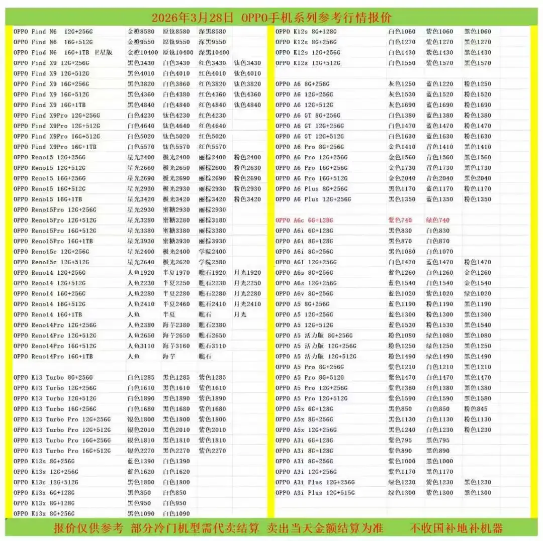 | 鸟哥收货华为/oppo/vivo系列结算价(前一天的结算价) |