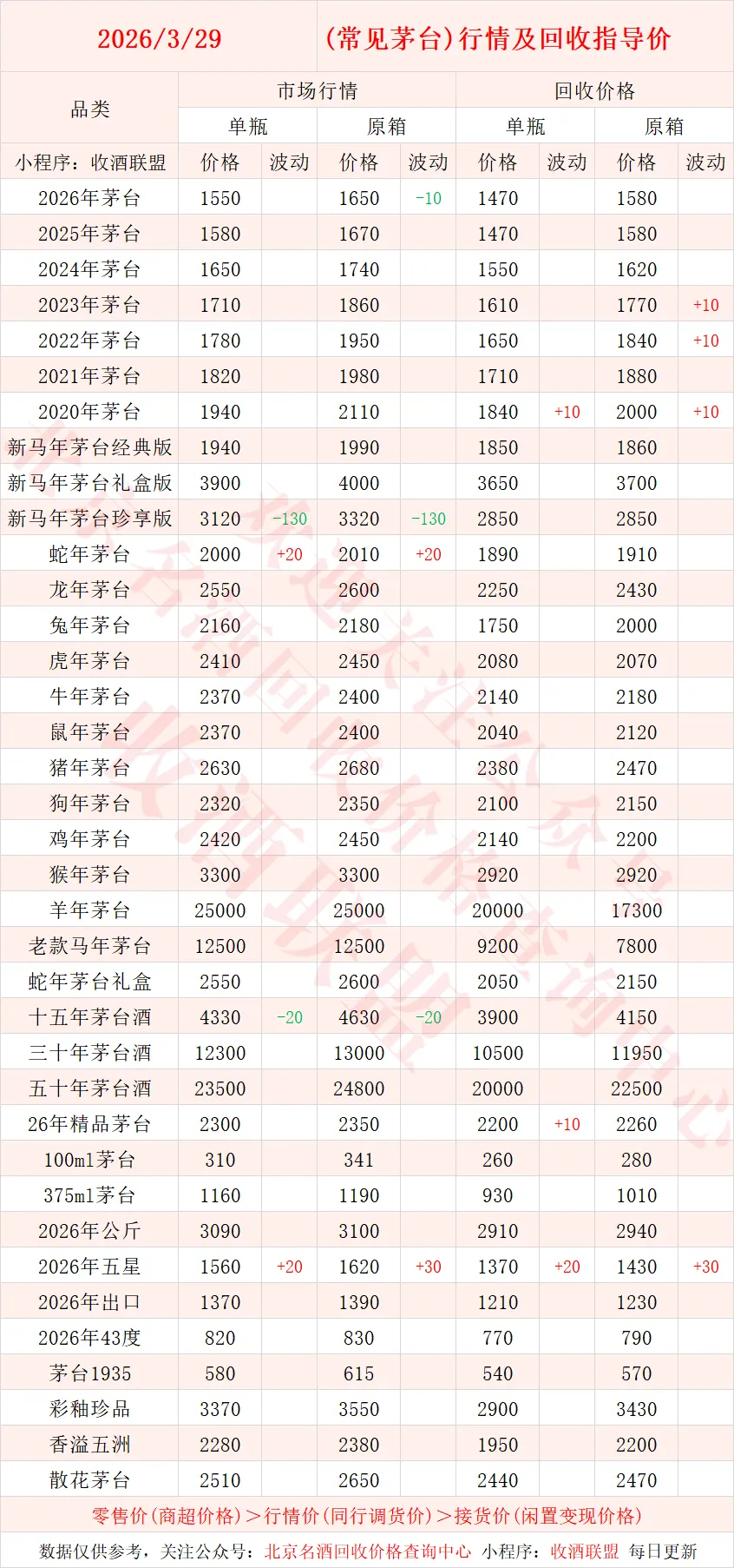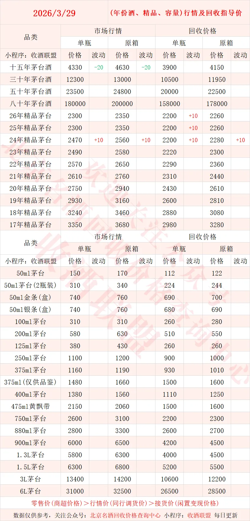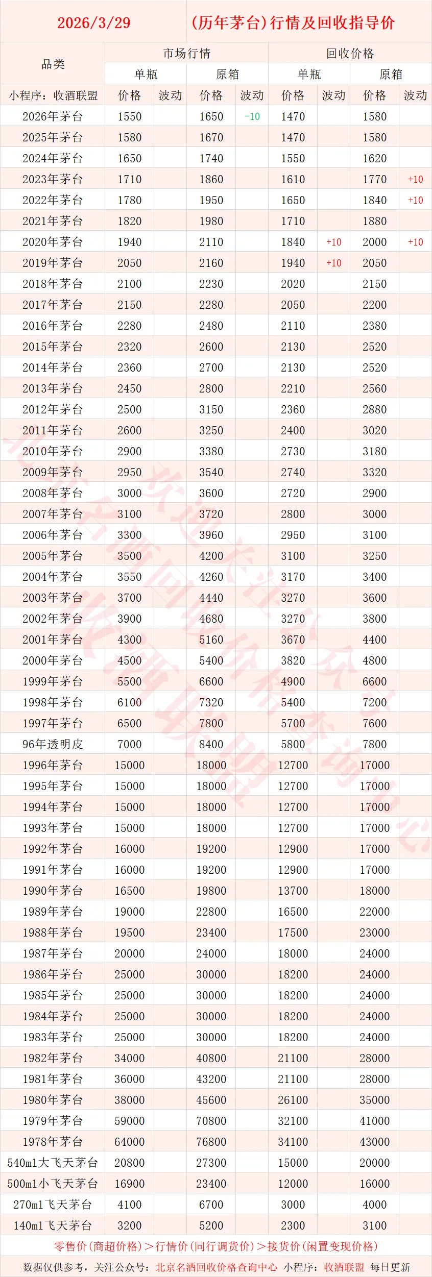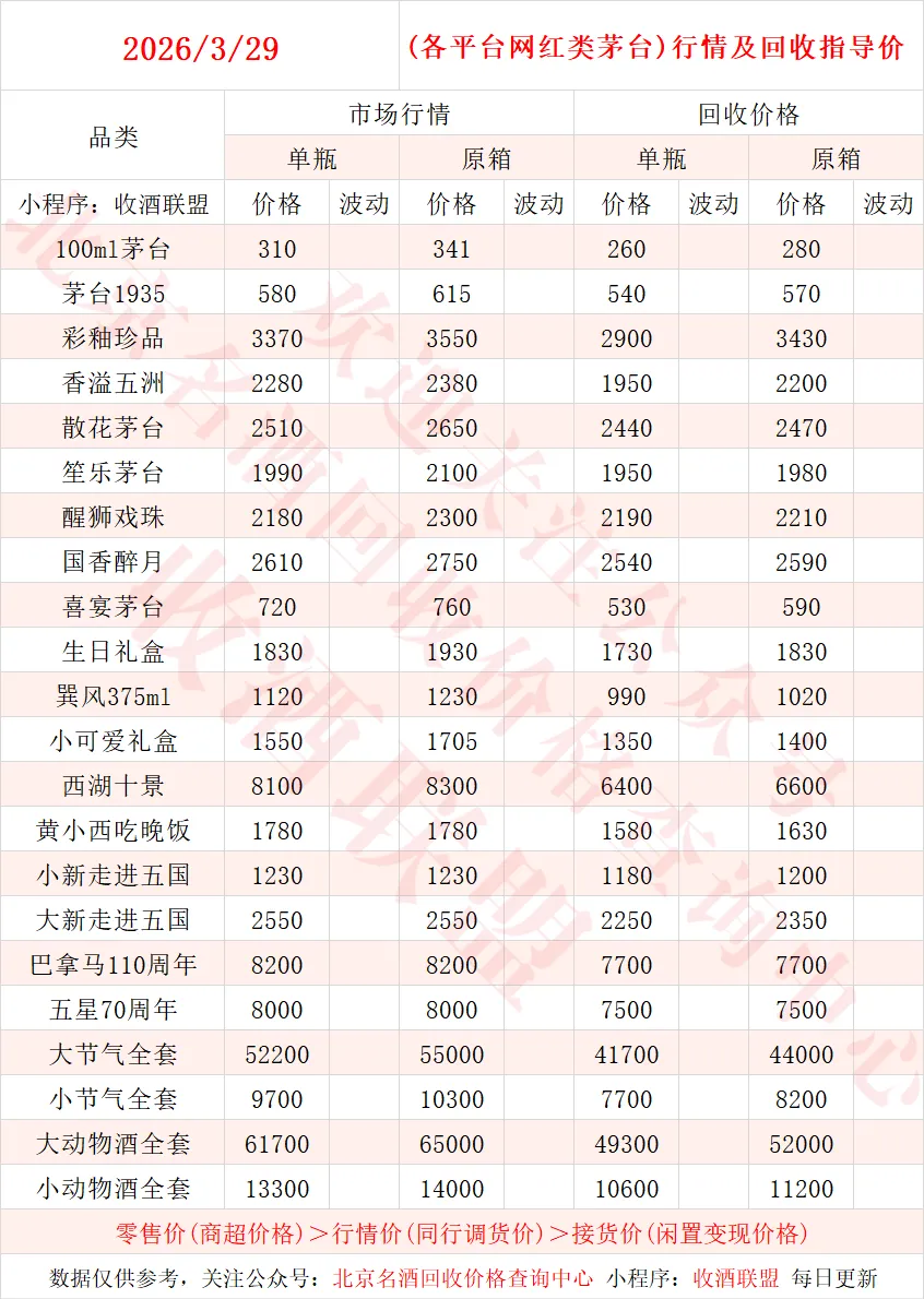 以下内容为,本公众号每日会及时更新的飞天茅台、生肖茅台、年份茅台,陈年茅台及不同毫升容量茅台的市场行情和回收报价;还包含五粮液、汾酒、剑南春、泸州老窖等国产名酒的行情及回收价,法国拉菲、木桐、玛歌等名庄红酒的回收报价,轩尼诗、马爹利、人头马等世界知名洋酒威士忌的回收参考价,每日整理不易,请点击关注支持。▪畅销类茅台行情及接货参考价▪