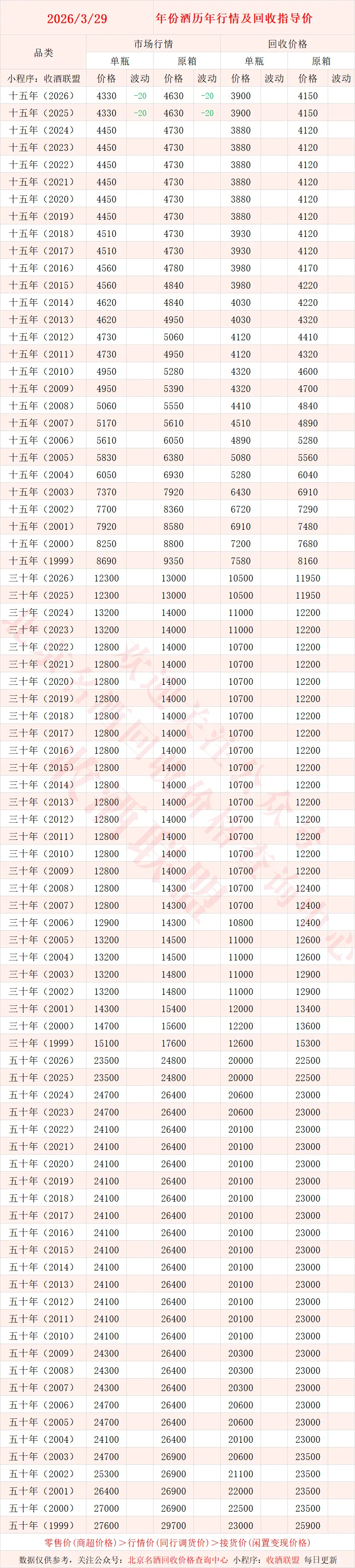 北京名酒回收价格查询中心,联系电话15652897909【同微】,专注于名酒回收行业的综合服务平台!是北京市价格认证中心、天津市价格认证中心的特聘专家,从业多年积累了各种名酒真伪鉴别经验,拥有多名品酒师、鉴定专家!累计服务数十家各省市价格认证评估,旗下小程序 “收酒联盟”,提供一键查酒价,不仅能一键查询各种名酒的价格,而且每日都会及时更新,保证你看到的都是新的准确行情。直接面向大众提供老酒,红酒,洋酒等真伪鉴定回收变现服务,回收价格专业靠谱!经过十余年磨砺,在全国100余座城市、四千多家业务会员酌情提供上门回收,是名酒回收行业中的翘楚!