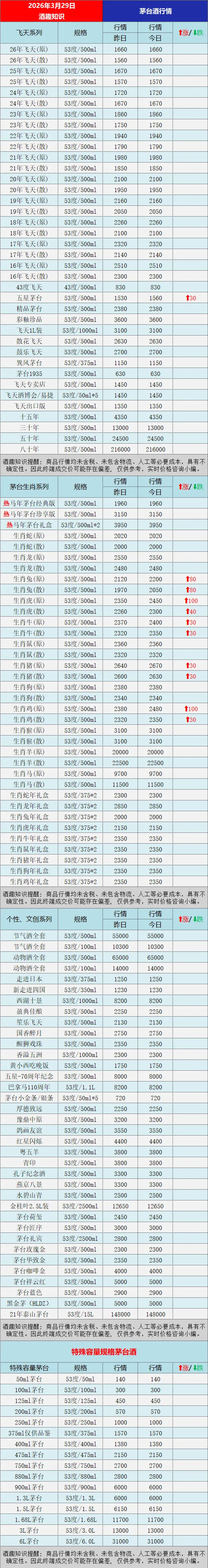 茅台酒行情价格参考:五星茅台大幅上涨;生肖系列,兔年、虎年、牛年等多个年份的生肖茅台大幅上涨。更多茅台系列酒具体行情参考下文图表:《酒趣知识》温馨提醒:商品信息均未含税、未包含物流、人工等必要成本,具有不确定性。因此终端成交价可能存在偏差, 仅供参考,实时价格咨询小编。注意:茅台等品牌老酒价格小幅波动频繁,老酒受品相克重影响价格差异大,同时不同地区价格有几十元不等的差价,最终以实际成交价格为准!《酒趣知识》多媒体平台同步给您带来茅台酒及时行情参考,同步深挖茅台、五粮液、汾酒等各大名酒资讯,为酒友奉上客观的价格参考与专业的行业解读,让大家用酒有价可依、避坑无忧。丨声明:部分图文来源于网络,版权归原作者所有,如涉及版权等问题,请及时与小编联系删除或修改。