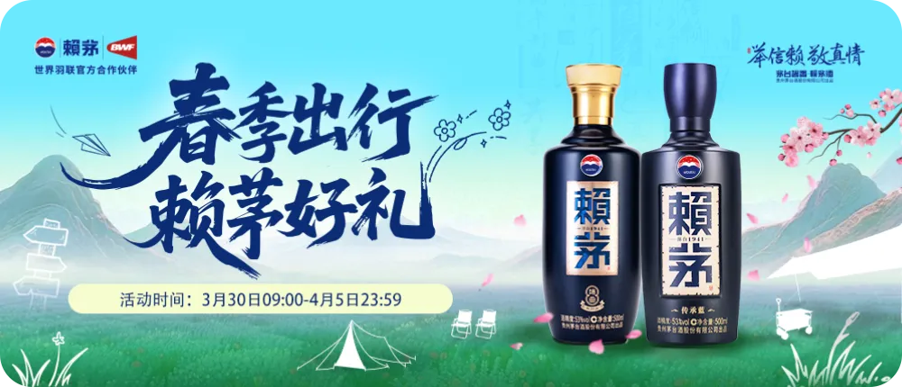 3月30日09:00至4月5日23:59,亲们登录i茅台APP,点击进入“春季出行 赖茅好礼”活动页面,可享53%vol 500ml赖茅酒(端曲)(2.0)活动价258元/瓶(零售价368元/瓶)、53%vol 500ml赖茅酒(传承·蓝)(2.0)活动价358元/瓶(零售价468元/瓶),购买即享赠品,买1瓶也有好礼相送。亲们购买活动产品达指定条件,可获赠赖茅定制露营四件套/五件套、赖茅定制一键开盖茶杯礼盒、赖茅定制摩飞便携烧水杯、赖茅定制玻璃茶水分离杯、赖茅定制直杆伞等精美礼品,为春日出行增添一份惬意。