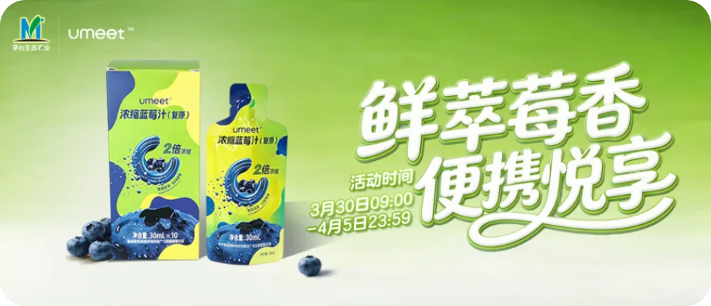 3月30日09:00至4月5日23:59,亲们登录i茅台APP进入“鲜萃莓香 便携悦享”活动页面,可按49元/盒购买UMEET二倍浓缩蓝莓汁(复原)袋装(30ml/袋×10袋/盒),单笔订单购买3盒,可获赠同品1盒优惠哟,单盒到手价只需36.75元。精选清新好物,让春日的每一口都充盈美好。