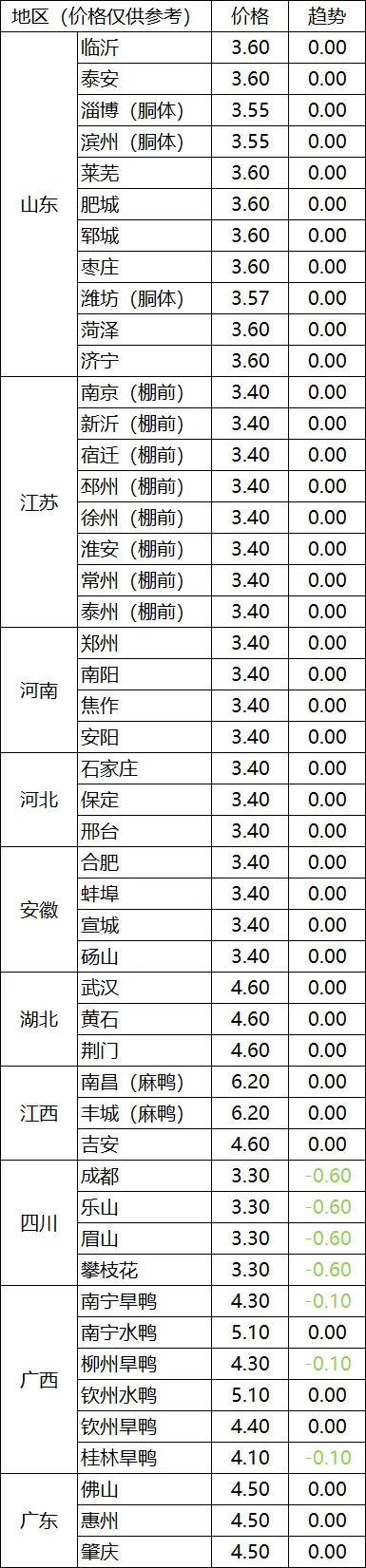 宿迁地区肉毛鸡棚前收购价3.40-3.50元/斤,与28日相比持平;