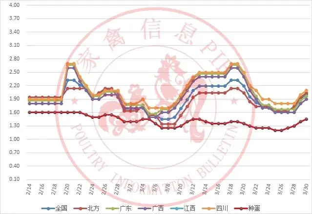2026年2月13日-2026年3月29日主流地区白羽鸭毛鸭均价走势图