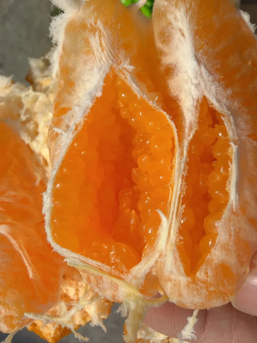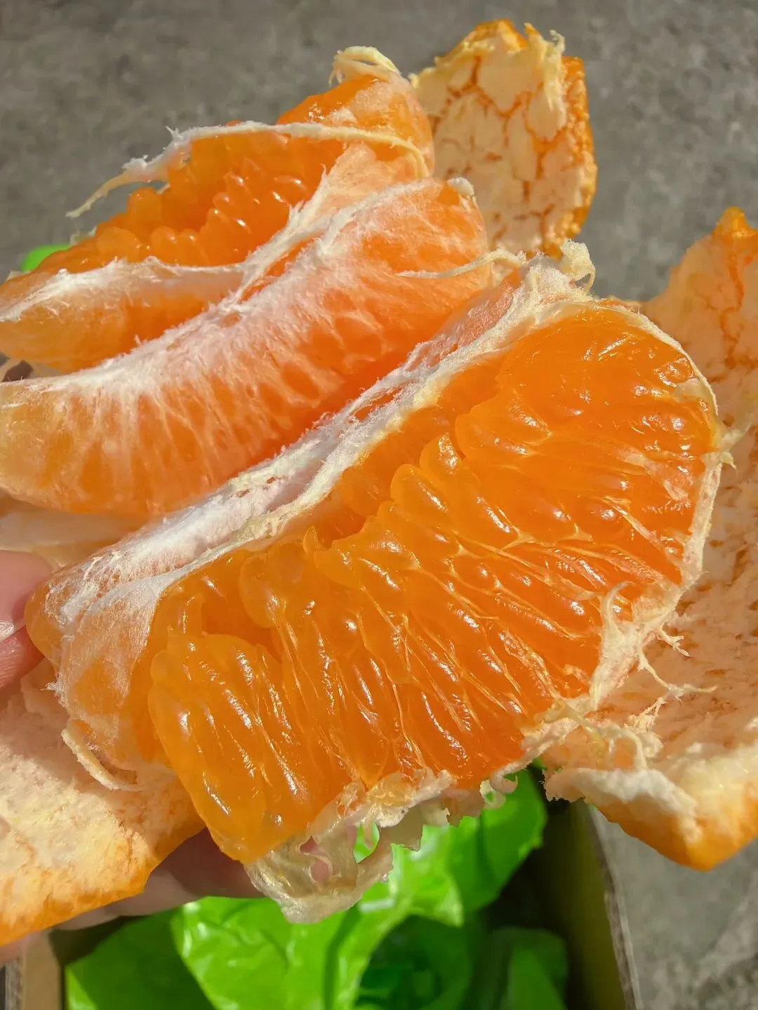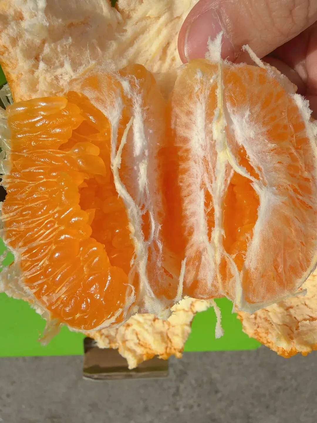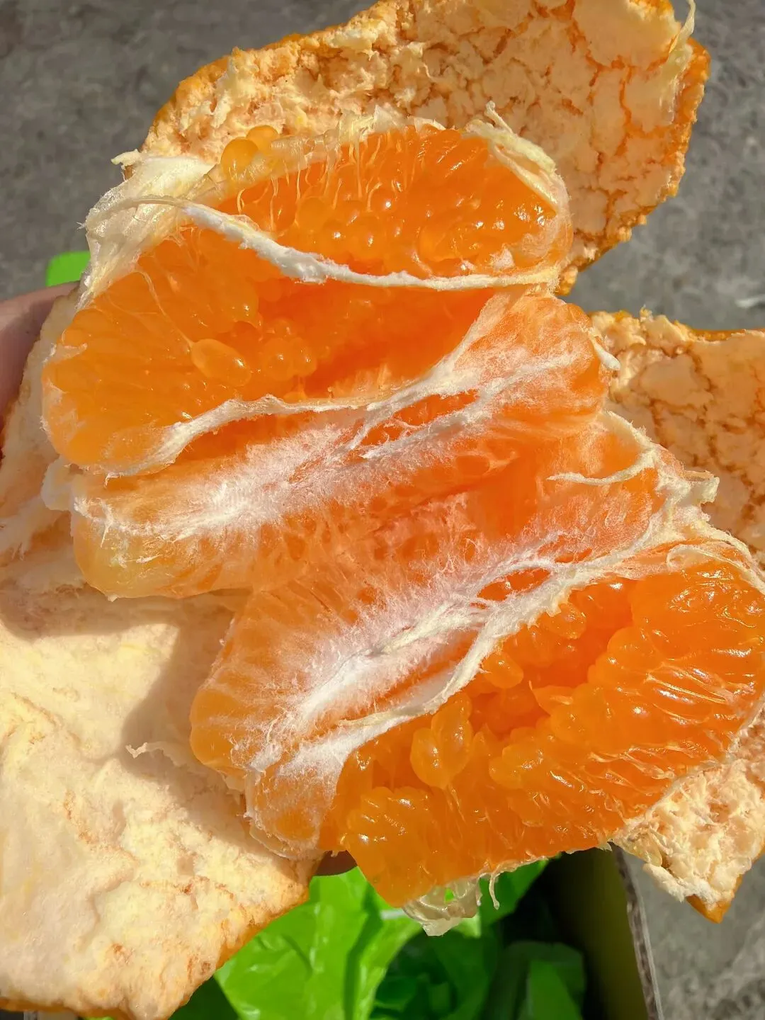 那种甜,是收敛的、不张扬的。 它不会第一口就猛地冲上舌尖, 而是在齿间轻轻化开, 像山泉水一样,清冽甘醇, 咽下去后喉咙润润的, 没有那种科技甜带来的干渴感。 市面上很多耙耙柑, 为了赶早市、抢高价, 果子还青着就摘下泡糖。 那样的甜,浮在表面, 吃几瓣就腻, 还烧嗓子。