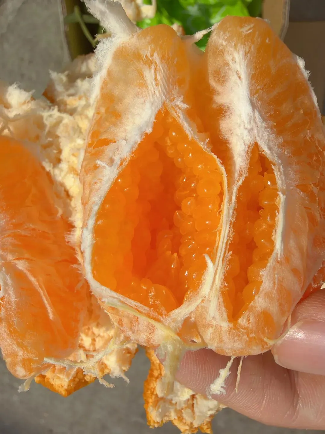 关于个头 为什么我们选中果? 卖了这么多年耙耙柑, 有个经验想和大家坦白: 大果(果径≥80mm)确实好看, 送人有面子, 但自己吃,真的不如中果实在。 原因很直接: 大果易“发抛”:个头大到一定程度, 果肉纤维容易松散, 吃起来口感发空, 像在嚼棉花。 容易干水:果皮过厚, 存储时水分反而流失更快, 放几天就容易“皮软肉柴”。 甜度不均:往往靠近果蒂的部分还偏酸, 尾巴部分才甜。