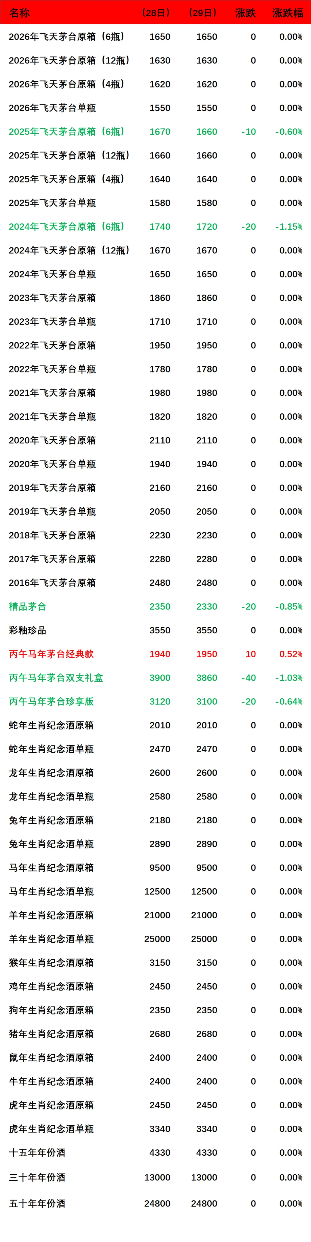 2024年飞天茅台原箱(6瓶),2025年飞天茅台原箱(6瓶),精品茅台,丙午马年双支礼盒,丙午马年珍享版下跌。