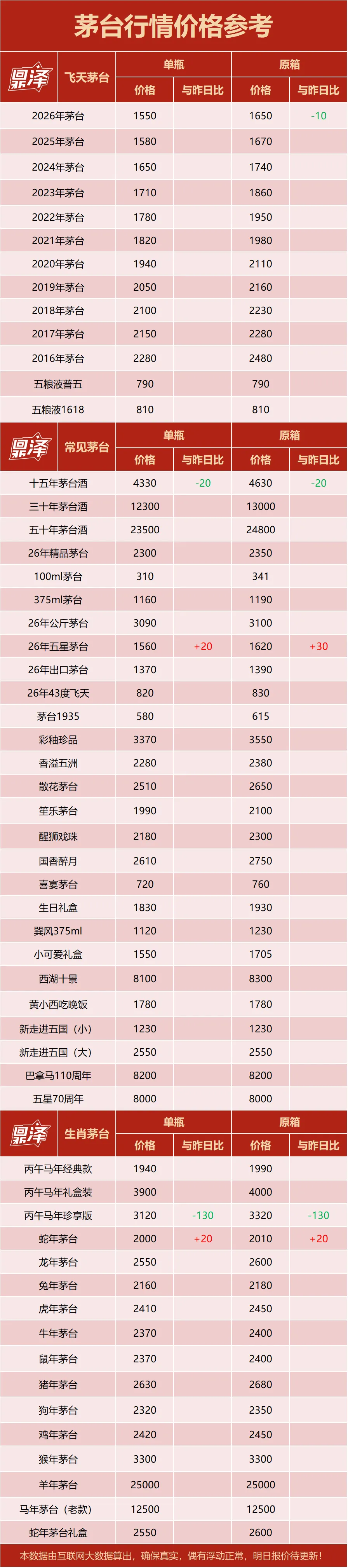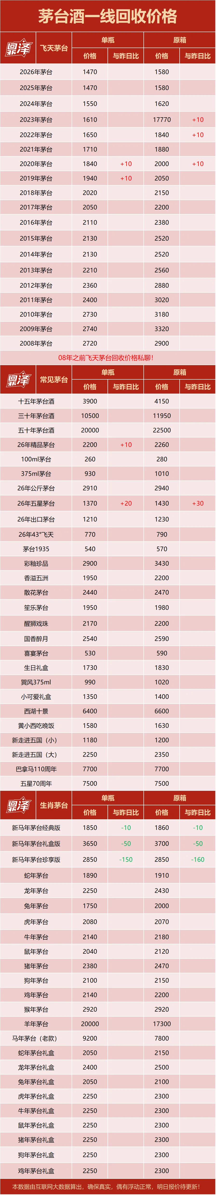 Step >> 价格解析 ✅ 行情价:本公众号发布的价格是行情价格,是全国酒商调该品类茅台的价格,是零售价和回收价的基准价格。 ✅ 销售价:销售价格一般高于行情价格,在行情价格的基础上,包含了运营、仓储、物流及合理利润等费用。 ✅ 回收价:回收价格一般低于行情价格,在行情价格的基础上,包含了鉴定费、人员的差旅费、合理利润等费用。 特别说明:鼎泽礼汇为全国礼品回收信息交流平台,商品信息均未含税、未包括物流费、人工费等必要成本。本平台行情价均来自于各地合作商家,其真实性、准确性和合法性由信息拥有者(合作方)负责。鼎泽礼汇不提供任何保证,不承担任何法律责任。 |