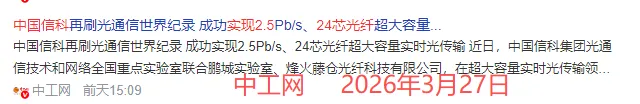 近期,我国国内企业在高端光通信领域接连取得关键突破,不仅补齐了短板,更刷新了世界纪录,极大地提振了市场信心!2026年3月,我国首次在10.3公里的24芯单模光纤上,实现了2.5拍比特/秒(Pb/s)的实时双向传输容量,这相当于每秒能传输约29万GB的数据,标志着我国在超大容量光传输技术上迈入全球前列,为AI算力网络升级提供了核心支撑!光通信的行情正蓄势待发!