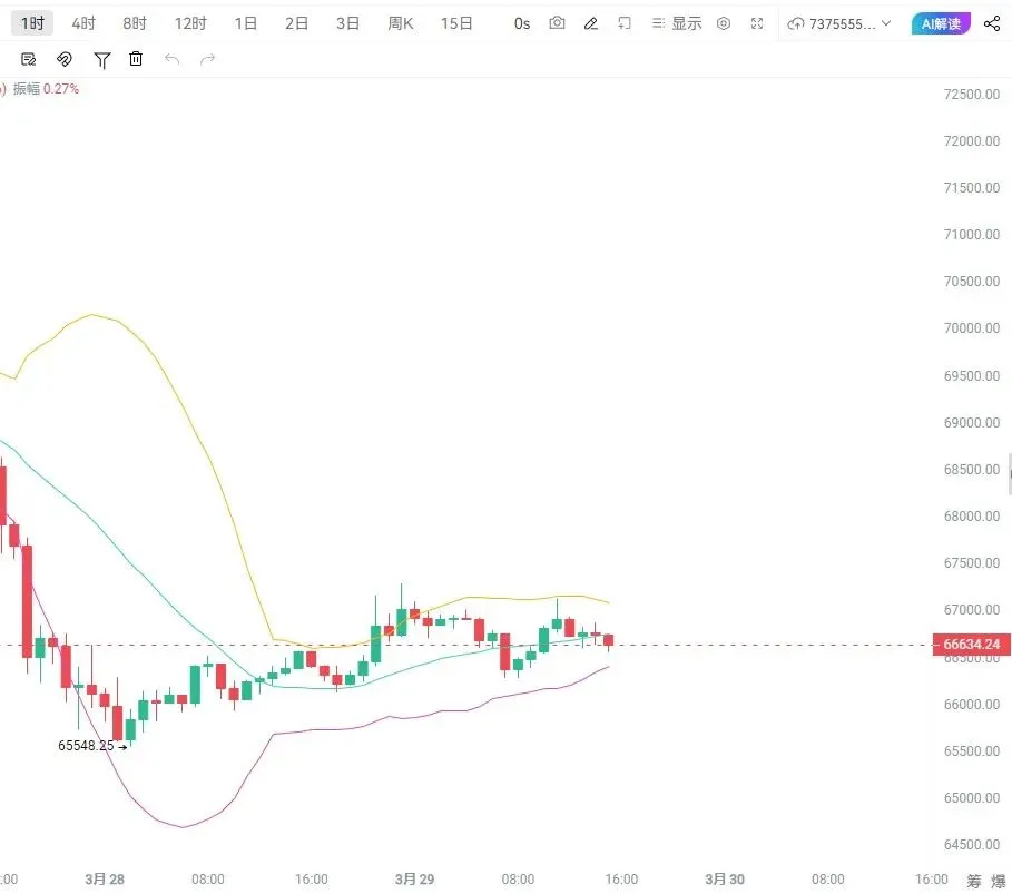 周末市场流动性较弱,币价整体维持震荡调整,没什么大的波动,静候震荡落幕,静待趋势花开,心定才能行稳致远。从一小时级别来看,币价仍处于弱势震荡磨底阶段,整体空头格局未变。这种窄幅震荡并非筑底信号,更像是下跌后的“蓄力休整”,操作上继续保持高空思路。比特币:67100附近空,看66000附近以太坊:2030附近空,看1960附近