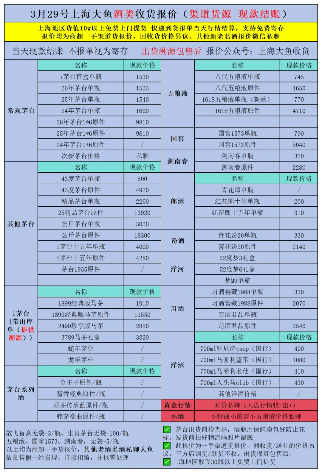 此报价为一手渠道货报价,回收货/送礼货价格另议,烟酒店回流货/三方店铺货/脏货不收,出货默认保真、永久溯源、包售后、故意售假扣货报警、不接任何国补货源