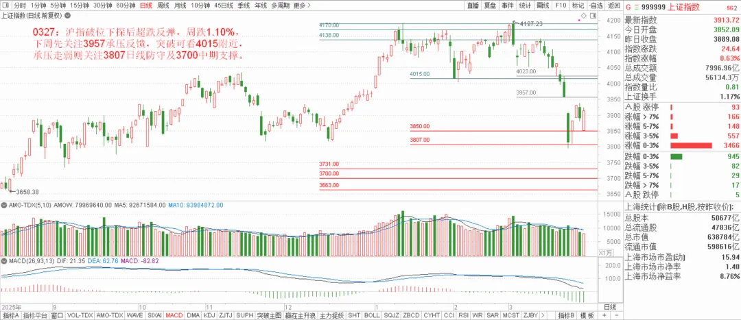 沪指周一跳空低开破位下行探至3800附近,周二周三超跌反弹,随后震荡盘整,周线收阴留长下影跌1.10%,市场走出周线级别回调及月线级别整理。当前量能萎缩叠加情绪修复不足,显示资金观望氛围浓厚,短期还有震荡反复,短线反弹先关注3957缺口承压,突破可看4015附近,若不能突破则延续弱势,需关注3807日线防守且不排除继续下探3700附近寻底的可能。操作上建议暂时控制仓位至五成以内,待量价协同信号明确后再择机加仓。