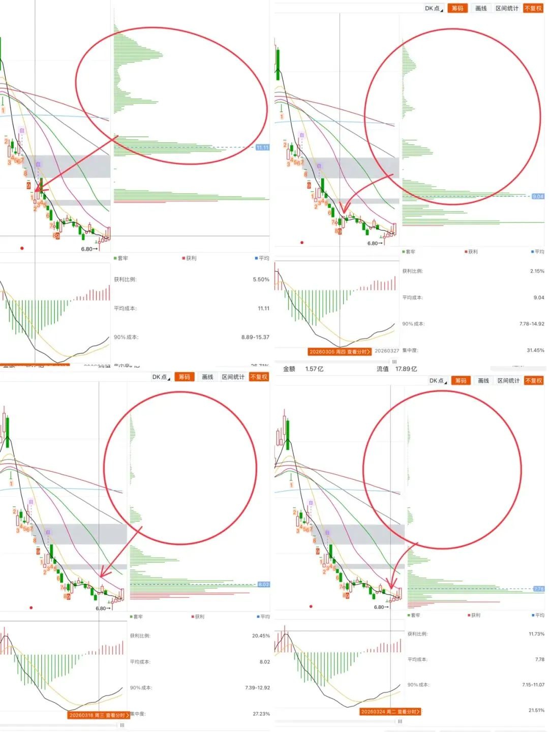 我们接着说下st翠华这个案例,上周我们说了新ST抄底点位,说了关注筹码峰变化,用图片更直观感受一下,是不是筹码换手沉底后,抛压会更少,而每次看是反转,又很容易被套!所以抄底要谨慎,地下室下面还有地下室,一个非批量反转大行情的盘面,加上预期并不强的标的,非常容易抄底被埋,结合翠华案例,你们再去看一下达华,就清楚了,不要被市场各种抄底声音所迷惑,现在市场无脑内卷的资金很多,没戴帽就去科普、没戴帽或者刚戴帽就去抄底,自己买完被套就开始发帖,这非常容易搞坏市场风气,我们不跟风,要有自己的判断