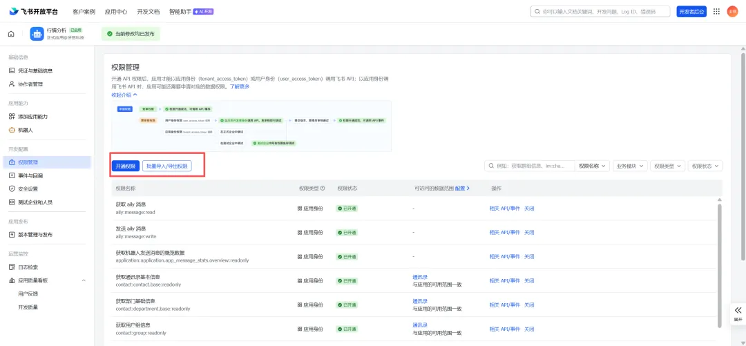 进入"权限管理" → "批量导入",粘贴以下权限配置: