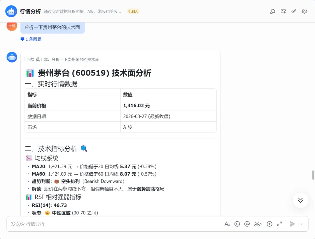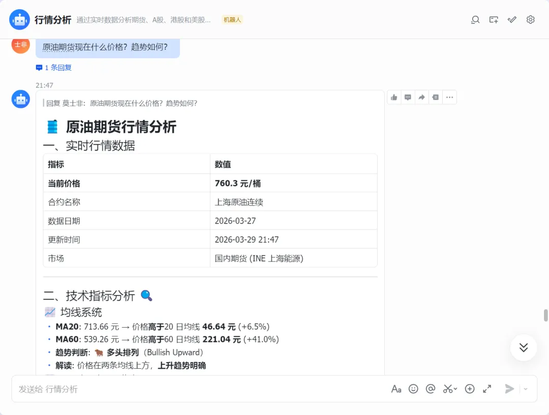 今天,我将带大家使用 OpenClaw 搭建一个AI 行情分析专家,它可以通过飞书机器人: