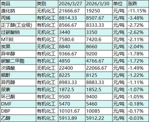 -回调品种集中可控,深度回调仅存单品:16种回调品种呈现“溴化钠单独深度回调、其余品种小幅至中幅波动”的特征,回调压力温和且集中于少数品种,未扩散至整个市场。溴化钠以-11.15%的跌幅成为今日最大回调品种,价格从21666.67元/吨跌至19250元/吨,属于供需格局失衡后的深度调整;丙烯(-3.48%)、正丁醇(工业级)(-2.72%)、过碳酸钠(-2.62%)构成第二回调梯队,涨幅在2%-3.5%区间;MTBE(-2.11%)、炭黑(-2.04%)构成第三回调梯队,跌幅约2%;异辛醇(-1.78%)、碳酸二甲酯(-1.72%)等7种品种回调幅度在1%-2%区间;DMF(-0.18%)、DBP(-0.17%)、乙醇(-0.03%)近乎平盘,属于短期供需博弈导致的正常波动,供需基本面未发生根本性变化。