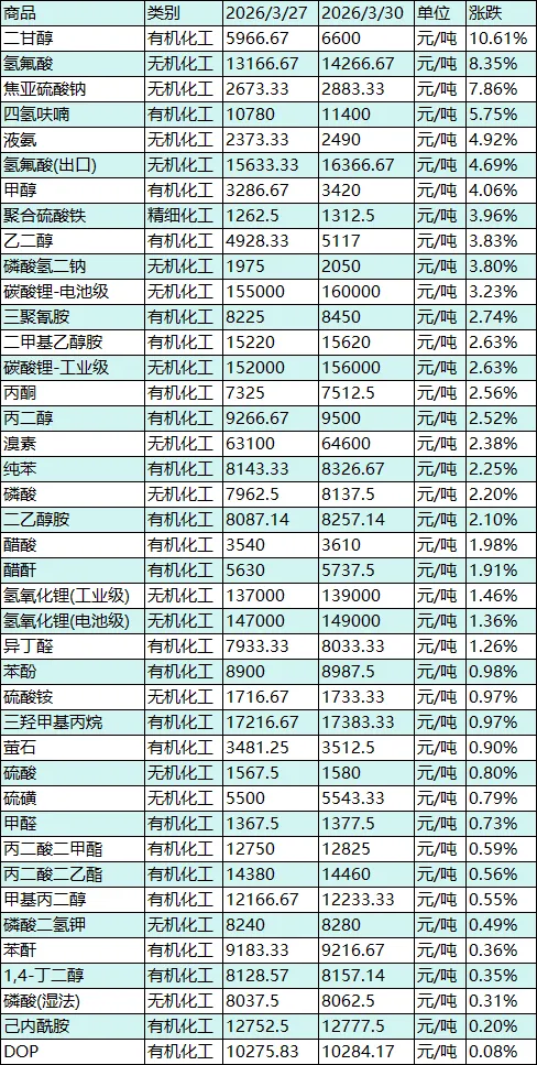 -甲醇(+4.06%)、聚合硫酸铁(+3.96%)、乙二醇(+3.83%)、磷酸氢二钠(+3.80%):成本传导+需求支撑,同步上涨。甲醇受国际原油飙升影响,成本支撑强劲,同时下游甲醛、二甲醚等行业需求回暖,采购需求增加,价格上涨4.06%;聚合硫酸铁用于水处理领域,春季环保整治推进,需求爆发,价格上涨3.96%;乙二醇受原油成本支撑与下游化纤行业需求回暖影响,结束此前回调态势,价格上涨3.83%;磷酸氢二钠用于化工合成、医药领域,下游需求复苏,价格上涨3.80%,协同跟涨市场整体回暖态势。