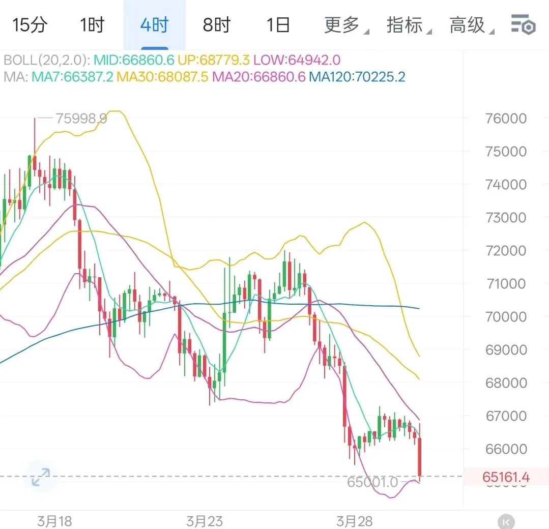 当前盘面来看,日线二连阴后转变为十字星k围绕下轨上方运行整理,行情回踩并未给到进一步的破位,目前处于短期回踩中的整理阶段,后续则是等待整理完毕后的回踩放量。结合四小时图来看,行情走出一定下行通道,短期得行情整理为空头走出一定蓄势的结构,而反弹高位整理后依然是放量阶段,但同时需要注意比价能否进一步跌破65000关口延续下探的势头,操作上继续高空为主。