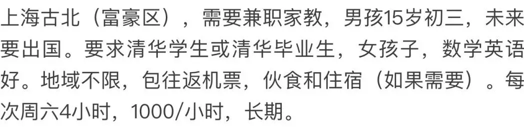 看人家上海有钱人招个兼职家教(只要清华),时薪都给1000块/小时,只需要每周六上4小时的课,还包往返机票…