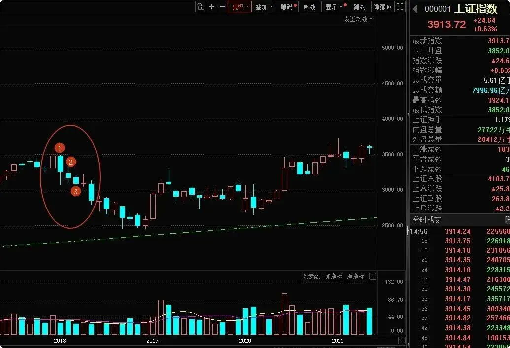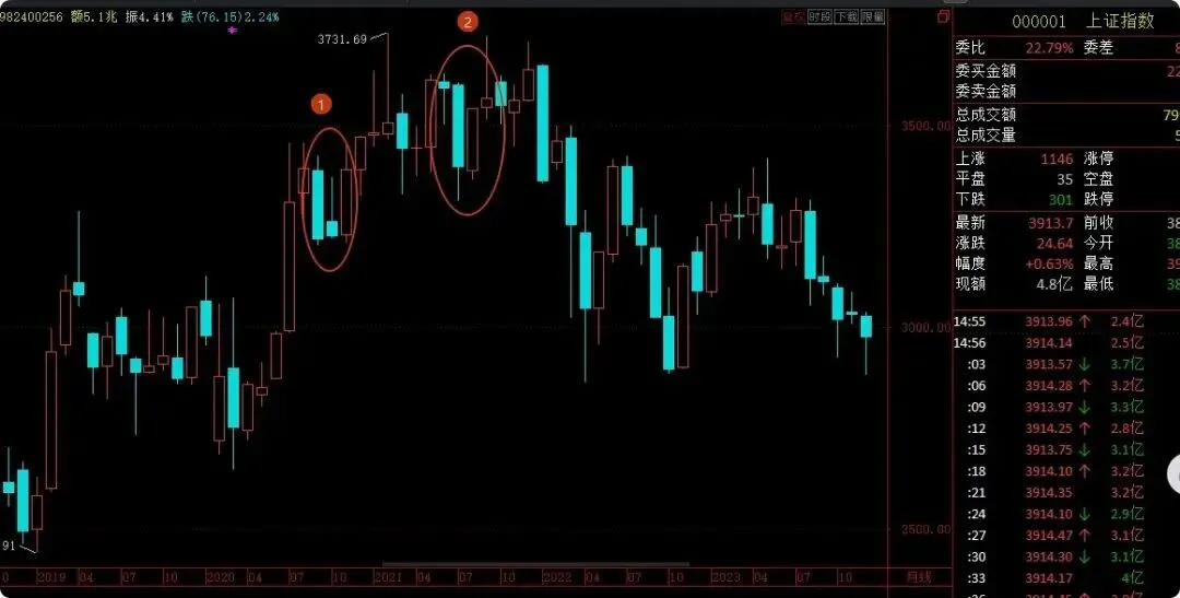当然,也可能是另外两种情况,比如2020年的大阴线之后,小阴线止跌企稳,然后反弹4个月;2021年的大阴线之后,同样反弹了2个月。