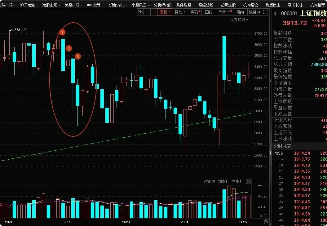 2022年,第个月度大阴线之后,指数小幅反弹3%,然后继续大跌。22年那一波下跌也是很惨烈的。