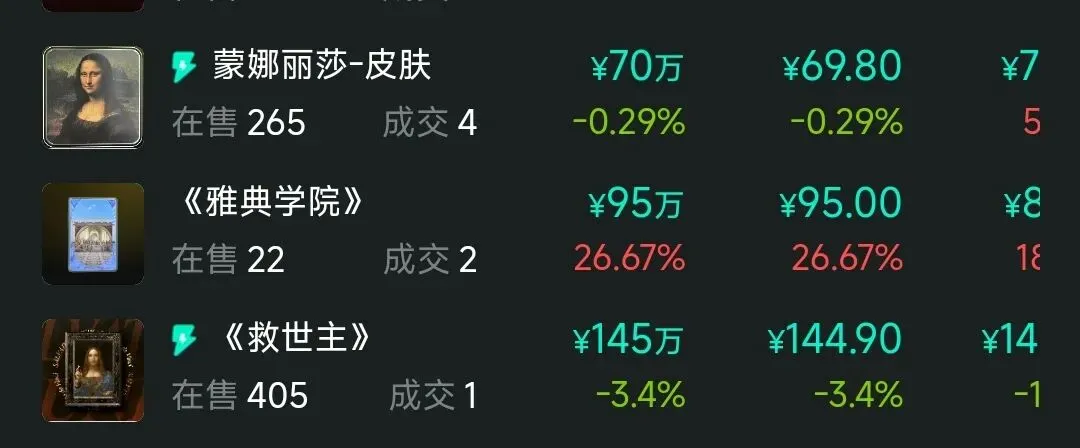 13.意大利文艺复兴,外国画龙头,标杆藏品蒙娜丽莎皮肤与场景跌至100元以下,试探承接较多。救世主跌至145元,开始向100元探底,50元级别以下藏品35种,价格坍塌明显,布局机会众多。