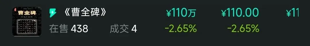 17.过云楼,标杆藏品曹全碑向100元探底,牌匾跌至2000元级别,50元级别以下藏品78种,10元级别藏品众多,价格坍塌非常明显,恐慌明显。
