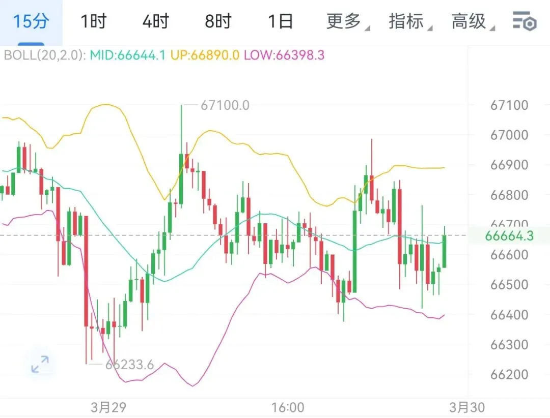 从当前盘面来看是下跌途中的蓄势,空头依旧占据主导,反弹只是给了我们更好的做空机会。从四小时级别来看,布林带持续开口向下,大饼在中轨下方反复承压,反弹高点逐步下移,下方65500的支撑虽有承接,但始终无法形成有效上攻。15分钟级别更是在66300-66900区间反复震荡,多头动能持续衰减,整体依旧处于弱势格局。