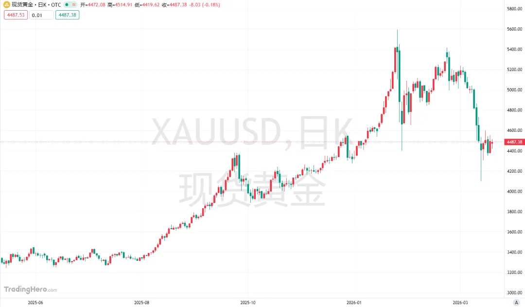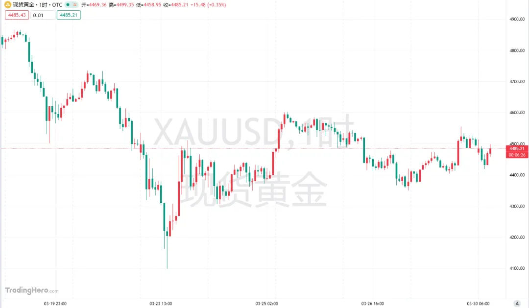 上周黄金市场呈现探底回升走势。周一盘中急跌后快速反弹,周二至周五转入震荡整理,全周最终收出一根带长下影线的小实体阳线,收盘位于4490附近,整体表现为急跌后初步企稳。周一(北京时间3月30日)亚市早盘,现货黄金开盘下跌约100美元后迎来回升,目前交投于4490美元附近。