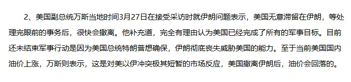 但是,美伊开始后,最近万斯被剔除了核心圈,所以他说的话就听一听就行了。美伊开始后万斯就频繁戳大金毛肺管子,公开性的唱反调,这点是判断是否再核心决策圈子的一个佐证吧