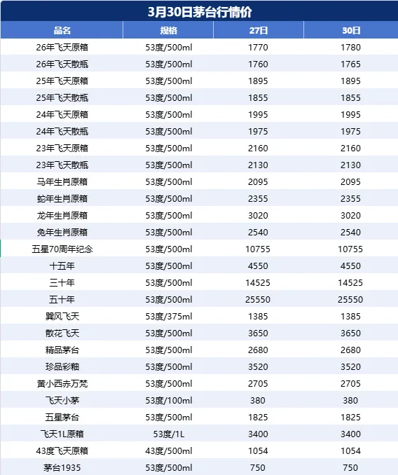 3月30日各品牌名酒采购行情价,仅供参考具体以实时为准!友情分享不代表某个公司批发价.
