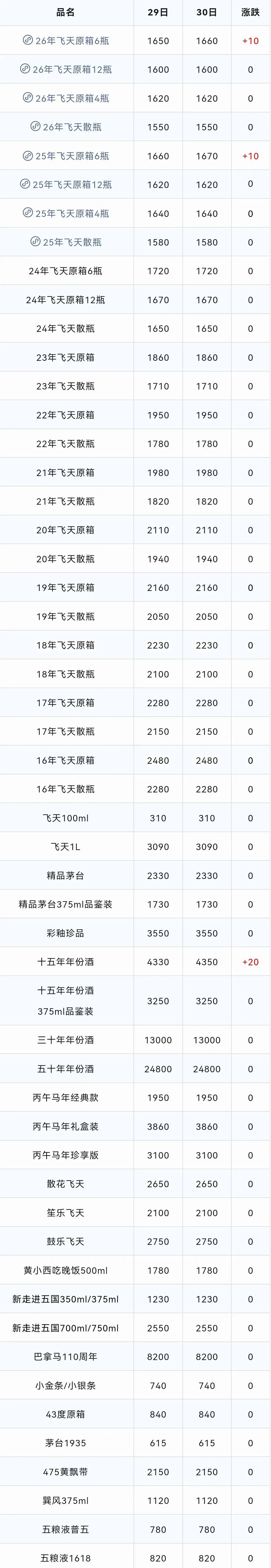 由于公众号平台修改了推送规则,如果不想错过“茅酒顾问”行情价,记得读完点一下“在看”,这样每次新文章推送才会第一时间出现在你的订阅列表里。今日(3月30日),从茅酒顾问发布的白酒价格行情监测数据显示,近段时间整箱茅台价格一直在1550徘徊,散瓶在1540左右,今日53度贵州飞天茅台(500ml)一批价跌至1660元左右!散飞在1550。