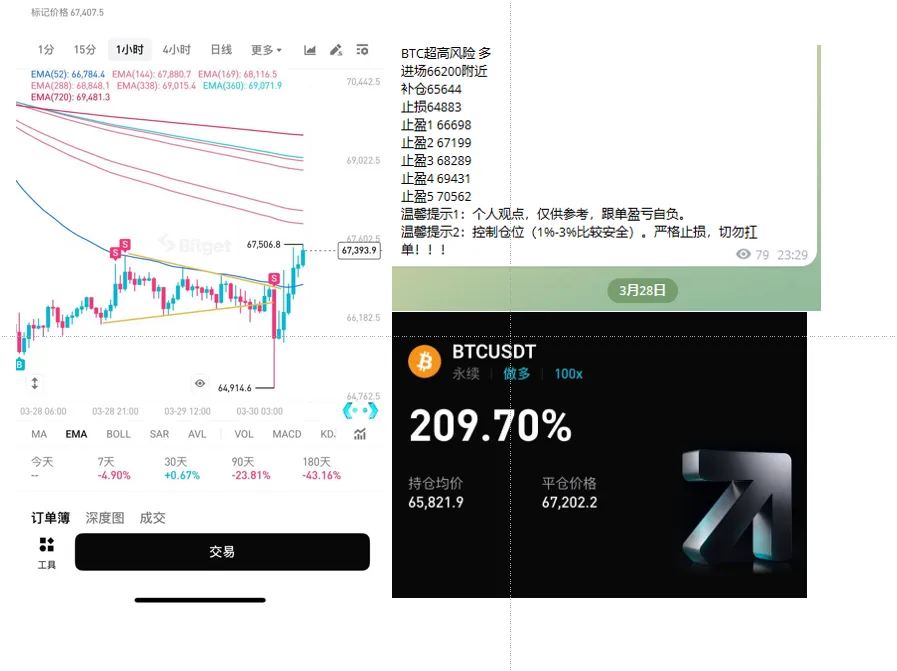 周五晚上开了66200-65644,均价在65820,止盈2次后设置保本损,早上被一根针打了,真是价格没变,仓位没了= =,还好昨晚睡前设置了保本损。