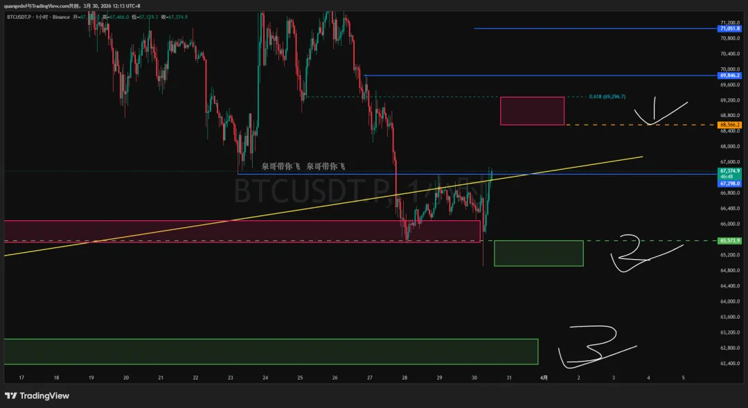 现在不好去追了,因为现在价格是在阻力边缘了,67300是一个重要的助力位置,如果突破,那么就可以上看,如果突破失败,那么则又可能形成67300-65514这样一个区间震荡。