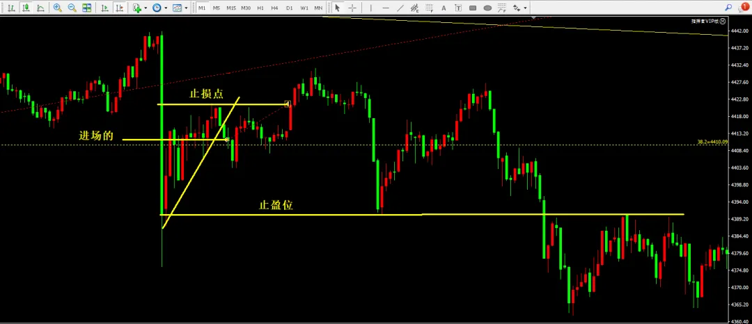 ⑤黄金1分钟出现形态破位,4410附近做空,止损4422,目标4390附近,亏损12美元。