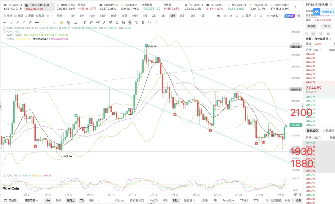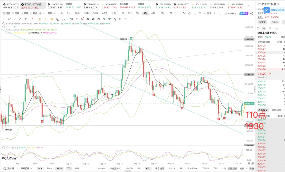 以太前期所分析支撑位1930,早间下探之后上涨110点,根据策略执行将暴力收割!!