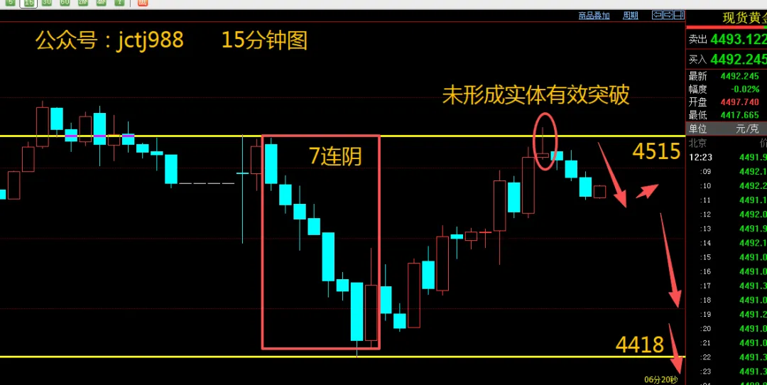 周线高位爆跌三连阴,于上周迎来下影线收阳,这说明有大资金来抄底。K线形态:从去年8月开始至3月持续7个月,周K保持45度上升,经过3月中旬持续爆跌,上升形态被打破,本周如果收阴线,有进一步下跌可能性,甚至破位4098,总结:在本周投资操作思路上,尽可能以《做空为主策略》,减少抄底做多思维!以15分钟图形态显示,早上6点开市先迎来了7连K阴线,市场先杀跌再以V型形态反转冲上日内新高4517点,但未形成实体收阳于4515上方,江晨技术面上保持看空,当前价4492,看空入场点4500-4490,先以60-90个点收益为止盈目标。