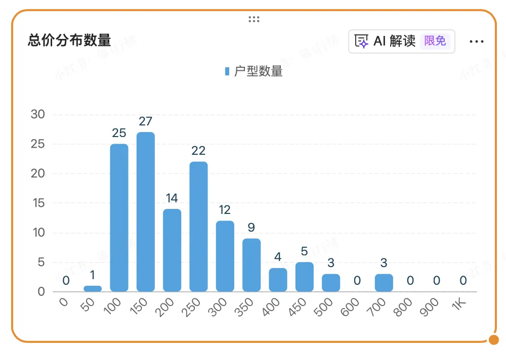 这个热门户型的总价分布数量表,同样验证了前面我们对龙泉驿市场分析是准确有效。