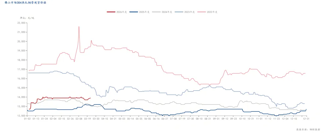 下游需求缓慢释放,全国不锈钢库存连续三周下降。截止至2026年3月19日,全国主流市场不锈钢89仓库口径社会总库存112.74万吨,周环比下降1.32%。其中冷轧不锈钢库存总量69.14万吨,周环比下降2.07%,热轧不锈钢库存总量43.61万吨,周环比下降0.10%。