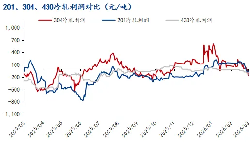 根据Mysteel即期成本&利润模型,截止3月20日,304冷轧外购高镍铁工艺冶炼成本14409元/吨,利润率-0.41%。201冷轧一体化工艺成本8553元/吨,利润率-0.04%。430冷轧成本7724元/吨,利润率-1.61%。304、201成本倒挂,