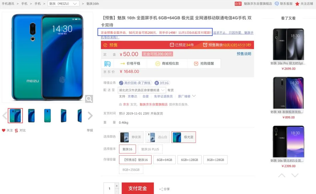 具体来说,魅族 16th 6GB+64GB 极光蓝版平时售价1648元,京东现可支付50元定金,11月1日0点起支付尾款,即可实付1498元到手。而各大手机品牌的双11活动最早也会于11月1日开启,各种立减券预计月底就会派发,所以双11有计划剁手的小伙伴一定要盯好各大平台。