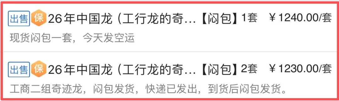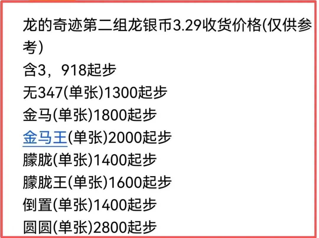 让众多藏友翘首以盼的龙的奇迹第二组,近期迎来了大涨的好消息,这两天已经开始陆续发货。对比刚面世时的行情,这一波上涨力度很明显,市场热度直接被点燃。从具体行情来看,龙的奇迹第二组官方发行价为909元/套,开售之初就遭疯抢,如今随着现货陆续落地,市场价格稳步攀升。目前闷包的成交价稳定在1150元—1250元区间,相比发行价溢价超25%;