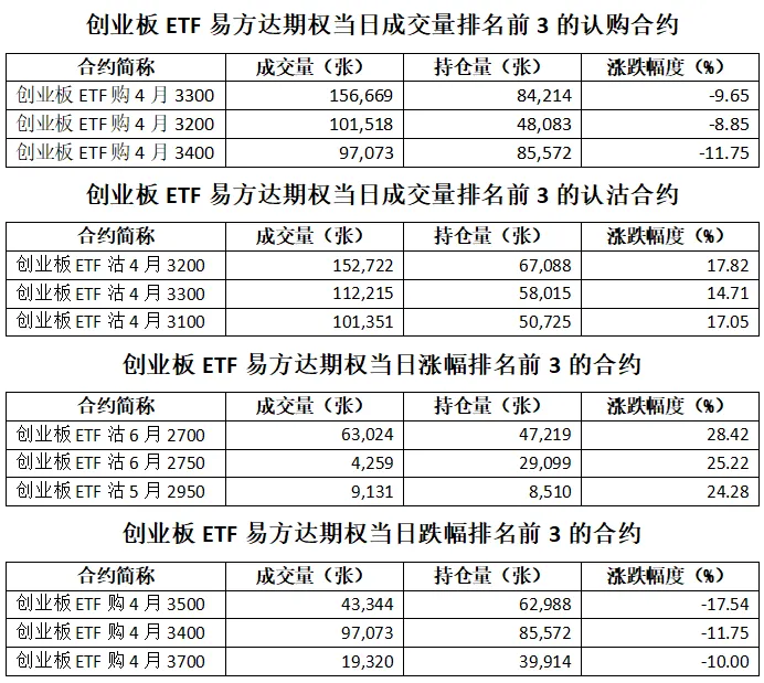 创业板ETF易方达期权总成交面额395.89亿元,增加2.15%,期现成交比为0.23,权利金成交额9.06亿元;期权总成交量1,229,505张,增加2.39%,其中认购期权成交量558,751张,认沽期权成交量670,754张,认沽认购成交比率为1.20(上一交易日认沽认购成交比率为1.17)。